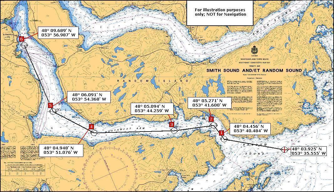 Your sixth waypoint is 48° 09.689’ N by 053° 56.987’ W, bearing 334° True; at a distance of 4.0 nm. This takes you just outside the Clarenville Marina, which is visible on your port side.